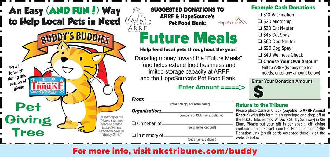 The NKC Tribune and Tribune Office Supply & Printing are teaming up with ARRF Animal Rescue and HopeSource’s Pet Food Bank again this holiday season to collect cash and check donations to go towards ARRF’s veterinary bills and future food & supply needs. All suggested donations printed on the envelope “tags” are pulled from the wish list of ARRF Animal Rescue.