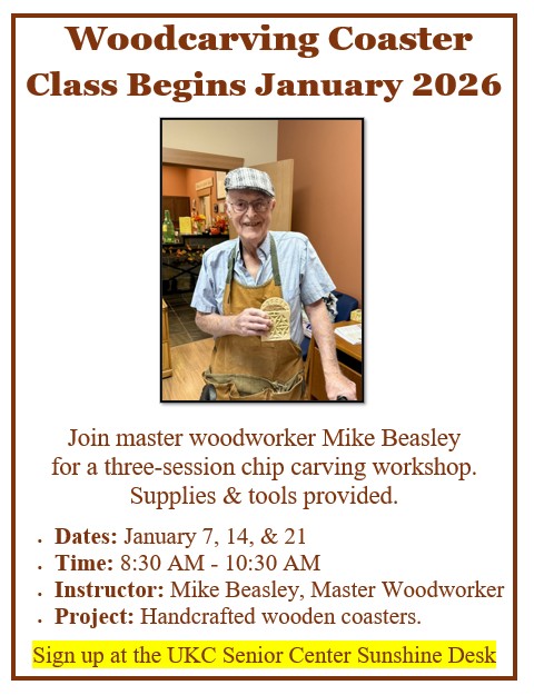 Join us for a coaster making class for 3 consecutive Wednesdays: January 7th, 14th, & 21st. 8:30am – 10:30am. Master carver Mike Beasley will teach the chip carving technique, appropriate for beginners through experienced. Supplies will be provided. Free for UKCSC members. $5.00 supply fee for guests. Please sign up at the Sunshine Desk by calling 509-674-7530.