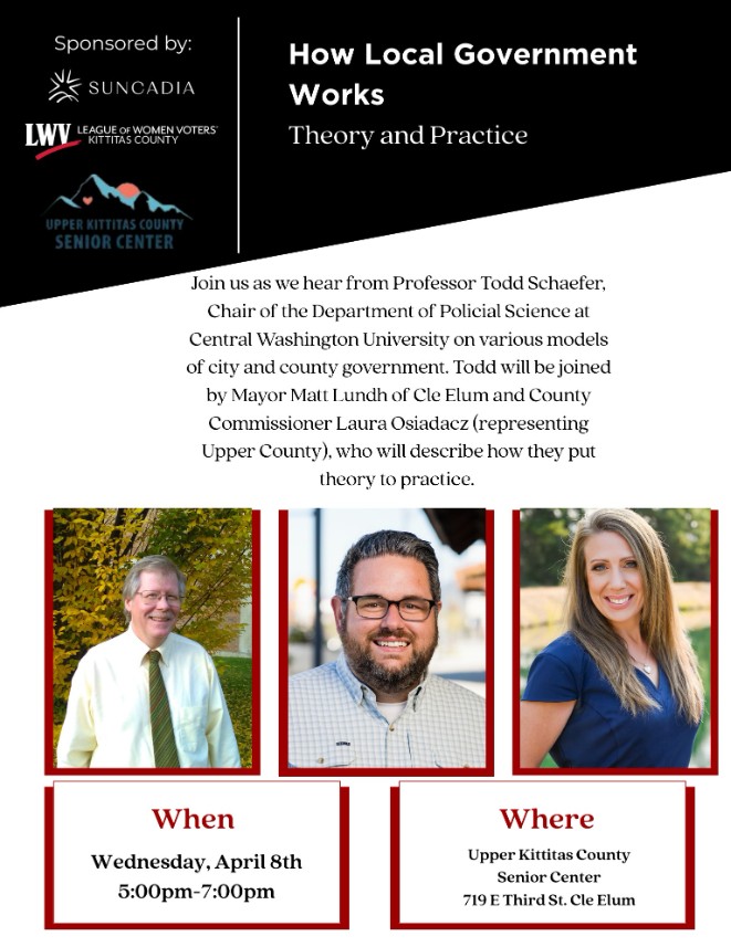 Join us as we hear from Professor Todd Schaefer, Chair of the Department of Political Science at CWU on various models of city and county government. Todd will be joined by Mayor Matt Lundh of Cle Elum and County Commissioner Laura Osiadacz (representing Upper County), who will describe how they put theory to practice here in our county.
