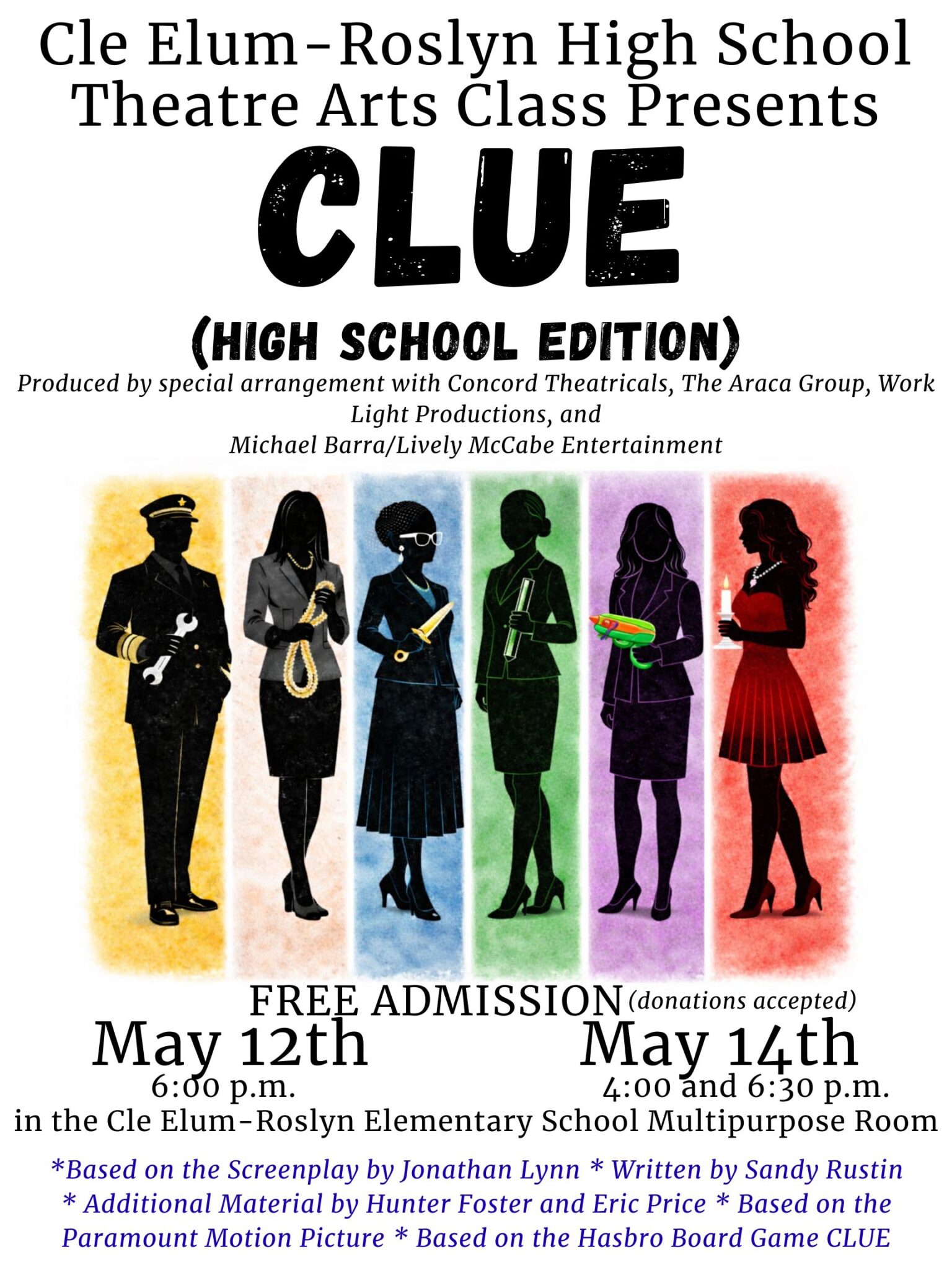 CERHS Theatre Arts Class Presents, CLUE (High School Edition). There are three performances to choose from! Admission is FREE! (Donations accepted)